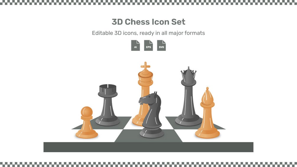 A highly detailed 3D Chess icon set in .AI, .EPS, and .SVG formats, featuring realistic and scalable chess pieces ideal for various digital and print applications.